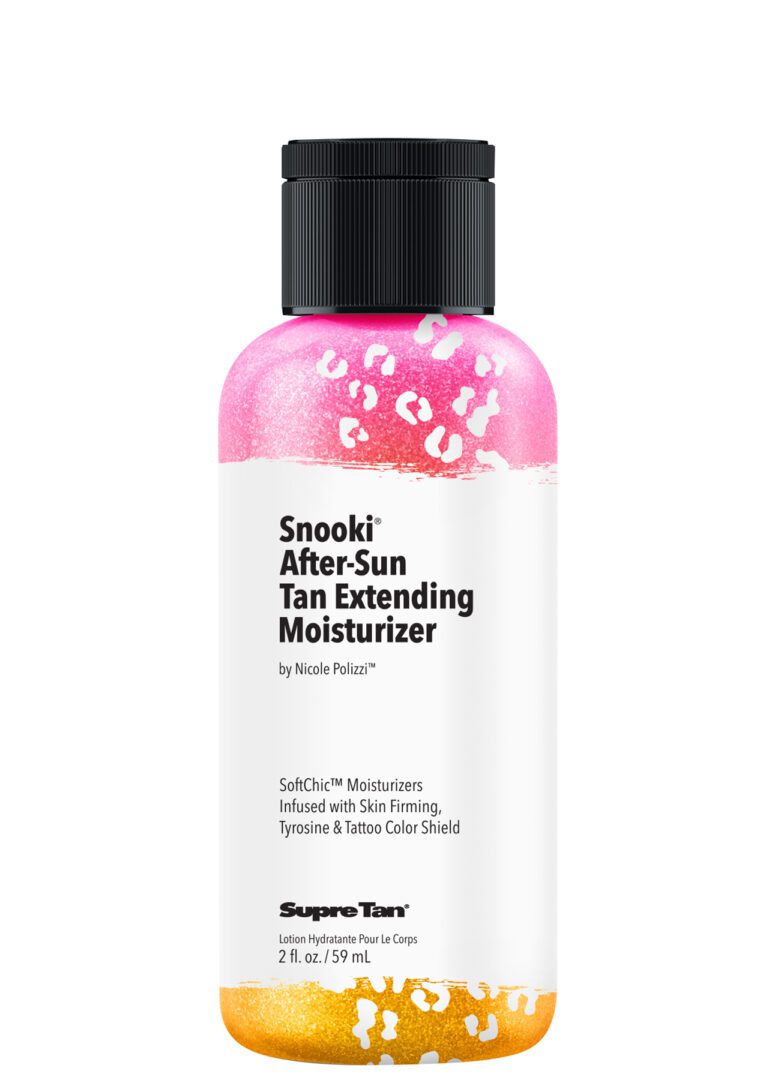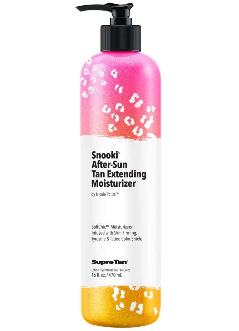 SNOOKI AFTER-SUN Tan Extending Moisturizer SoftChic Moisturizers infused with Skin Firming, Tyrosine & Tattoo Color Shield Keep your sun-kissed bronze going strong all year long with Snooki’s After-Sun Tan Extending Moisturizer. Packed with soothing and calming Aloe Vera, Shea Butter, Coconut Oil, and an advanced Vitamin Blend, this formula will help you achieve soft, radiant skin after UV exposure. Our exclusive Tattoo ColorShield Technology with skin nourishing Sea Kelp and Essential Minerals helps to maintain the color and vibrancy of tattoos, while our Matcha Skin Firming Complex and Tan Extending Tyrosine elevates your skincare routine to new heights. Your tan deserves a standing ovation, so give it the encore it craves!
